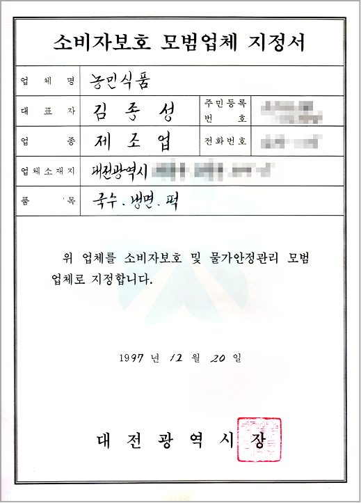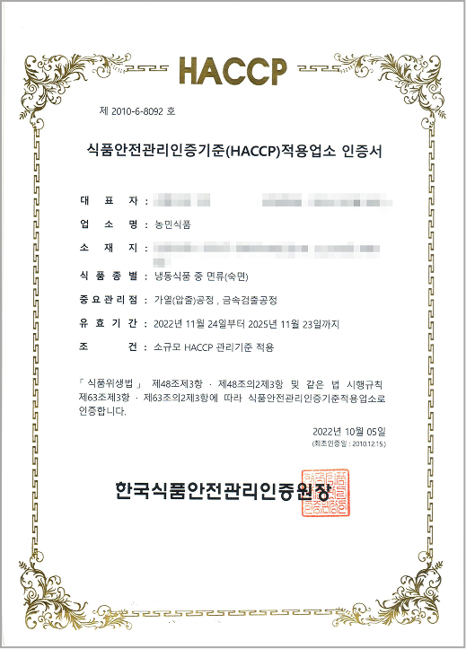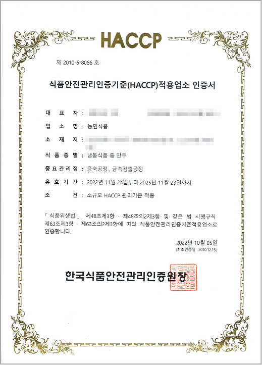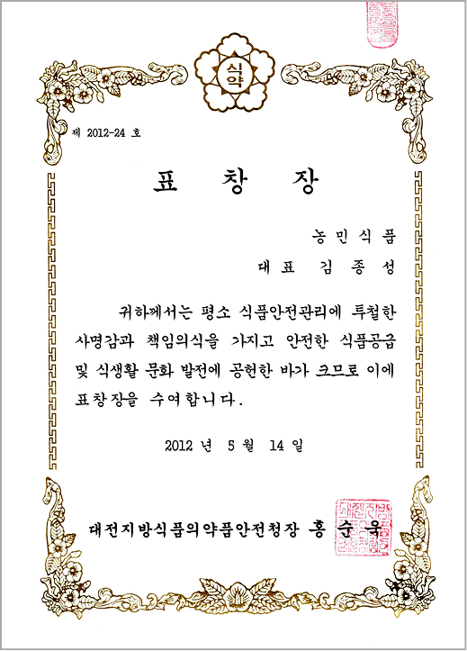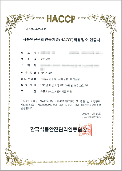 이러한 노력의 일환으로 식약청장상 수상, HACCP인증 및 소비자보호모범업체로 지정되었습니다.