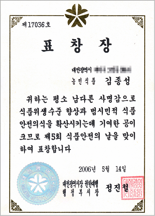 대전시장 표창장